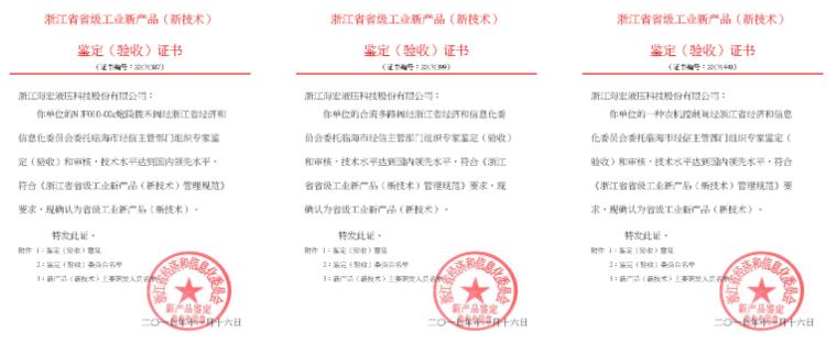 此次验收聘请浙江省机电研究院、中国轻工业自动化研究所、浙江工业大学、浙江理工大学、浙江省机电产品质量检测所、台州学院等专家成立了鉴定验收委员会,通过听取试制报告、审查产品检测、科技查新资料等方式对新产品进行了鉴定,公司的三项新产品在国内同类产品中处于领先水平,现场专家给予了高度评价。